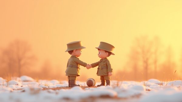 ठीक यही काम प्रथम विश्व युद्ध के पश्चिमी मोर्चे (Western Front) पर कई सैनिकों ने 1914 में किया था! इस अद्भुत घटना को क्रिसमस युद्धविराम कहा जाता है। यह जनरलों द्वारा योजनाबद्ध नहीं था; यह बस हो गया क्योंकि दोनों तरफ के सैनिकों—ब्रिटिश और जर्मन—ने फैसला किया कि उन्हें कम से कम एक दिन के लिए भयानक लड़ाई से ब्रेक चाहिए। वे अपनी खाइयों के बीच की कीचड़ भरी, बमों से तबाह जगह में मिले, जिसे नो मैन्स लैंड (No Man's Land) कहा जाता है।